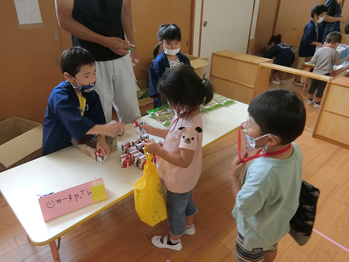 法被姿の年長児が「いらっしゃーい!」お店屋さんになってくれました。