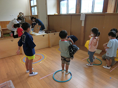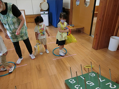 丸の中に入るかな?ボッチャを借りてきて投げ入れるゲームで楽しみました。