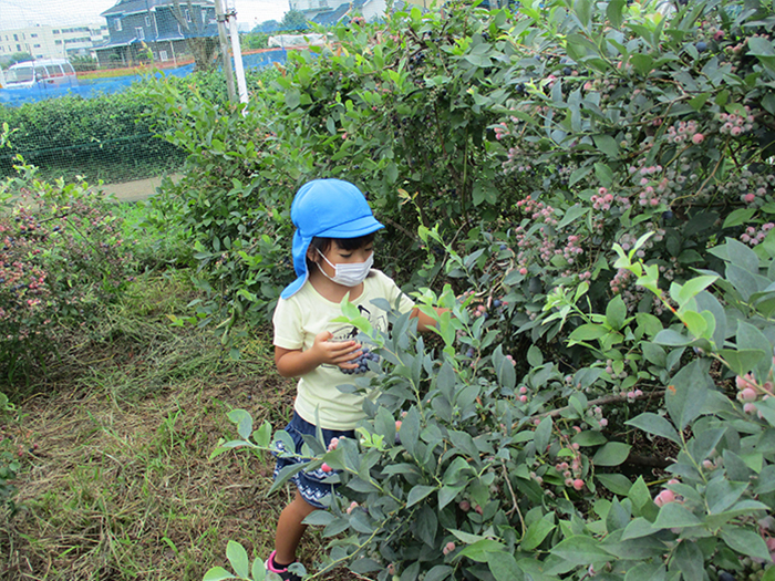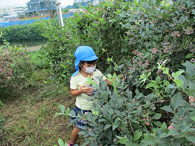 大きくて黒くて・・・どれが甘いか教えてもらいました。真剣な表情で探していました。 入れ物一杯にブルーベリーを摘んで喜んでいましたよ。