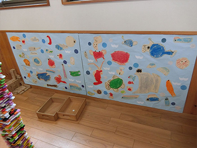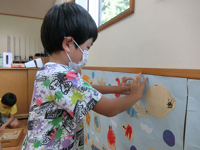 年長児です。魚の図鑑を見ていてみんなで魚の絵を描くことになりました。