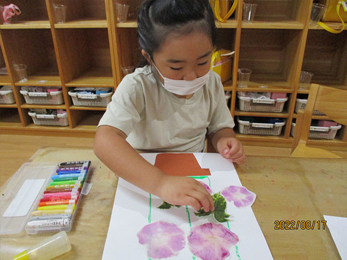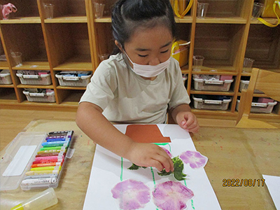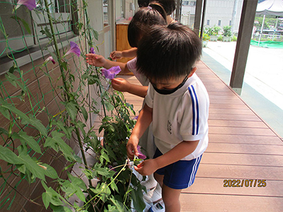4歳児です。たくさん咲いた朝顔のお花を使って楽しみました。