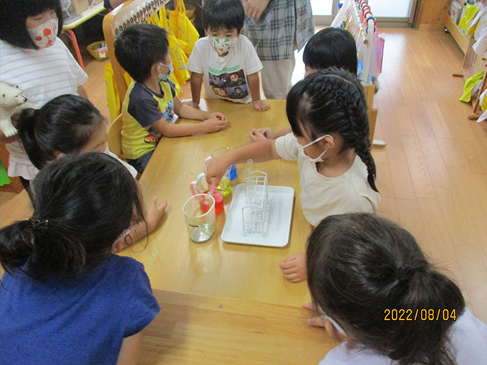 いろいろな朝顔の花で色水を作ってみました。色を混ぜると何色になるのかな?みんな真剣です。