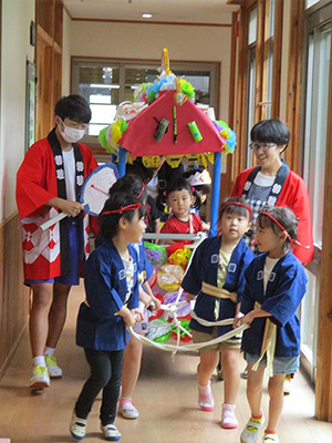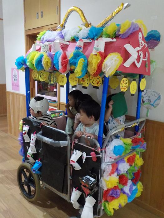 あさがお組さん(5歳児)の手作りの山車・・小さいクラスのお友だちを乗せて「エイサ~」と元気なかけ声で園内をまわりました。