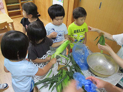 もも組(3歳児)がとうもろこしの皮むきのお手伝いをしてくれました。