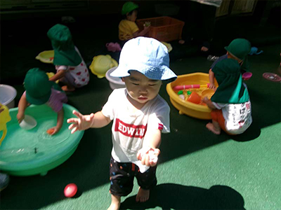 1歳児の水あそび・・氷を手のひらに乗せて溶けていく氷を不思議そうに見ていました。