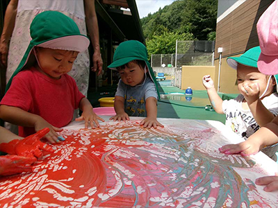 1歳児の絵の具あそび気持ち良さそうに感触と色あそびを楽しんでいました。