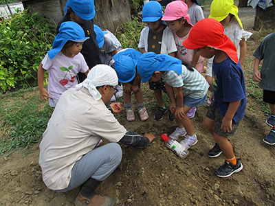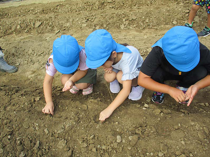 園長先生から大根の種の蒔き方を教えてもらいました。「あかいたねだ~」興味津々、真剣に聞いていた5歳児の子どもたちです。