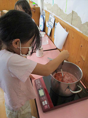 収穫したいちごでシロップを作りました。「あま~いにおい」「おいしくな~れ」