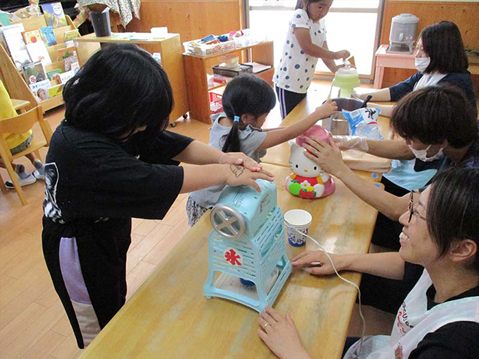 かき氷の機械を使ってガリガリガリ氷を削りました。「たのしい~」「もっともっと」山盛りになっている子もいました。
