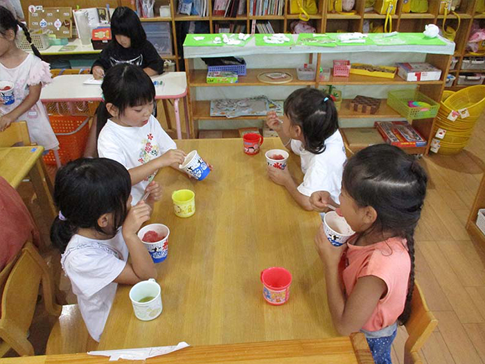 いちごのシロップもおいしくできて、イチゴのかき氷の完成!!「もっとたべたいな~」と★★★ 大好評でした。