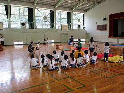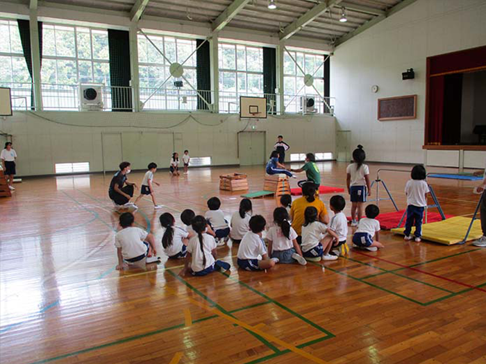 中学校の広い体育館でサーキットをしました。中学校の高い跳び箱にビックリ!!