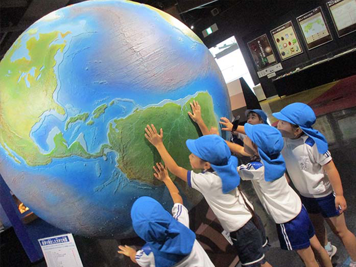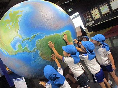 5歳児あさがお組が行って来ました。プラネタリウムや展示室で色々な物を見てきました。 大きな地球儀に興味津々・・にほんはどこかな?