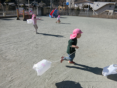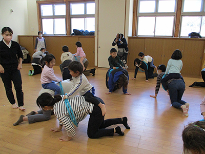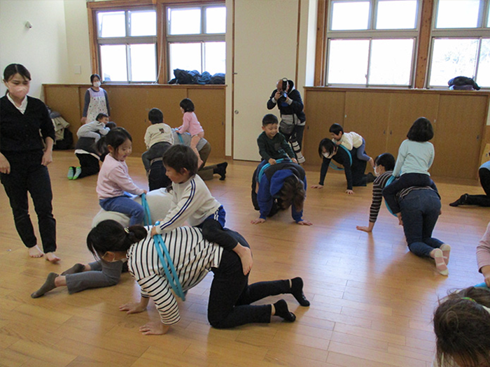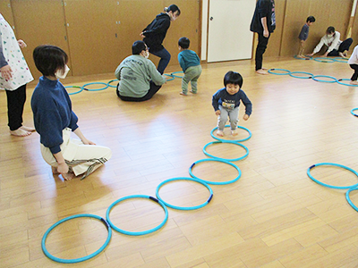フープをぴょんぴょん・・いろいろな動物になりきって元気いっぱい飛んでいました