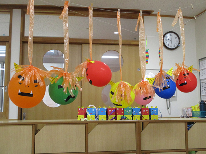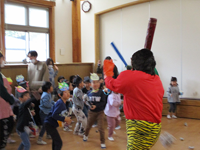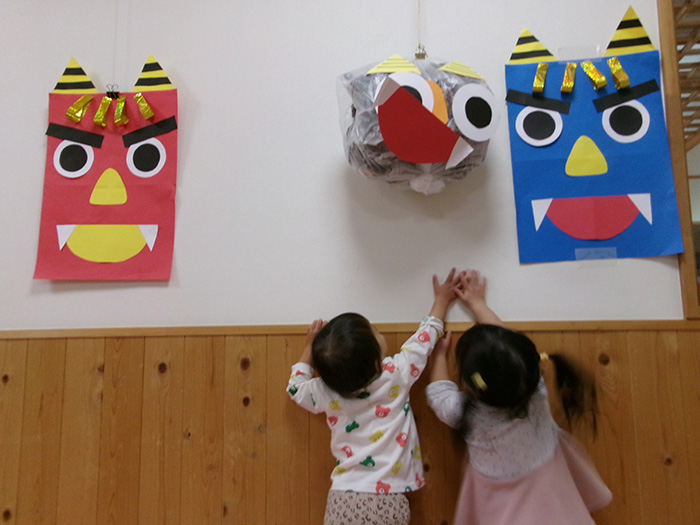 2歳児は風船の鬼に新聞で作った豆を投げて退治しました!!