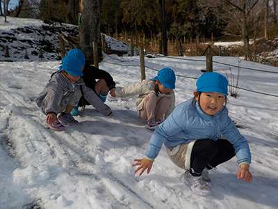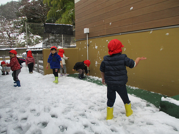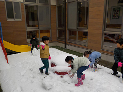 あさがお組(5歳児)が中庭で雪だるまを作りました。雪合戦も楽しんでいました 。