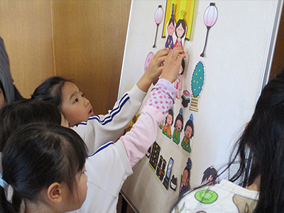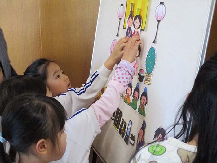 うれしいひなまつりの歌のパネルシアターを観ました。年長さんは触って楽しんでいました