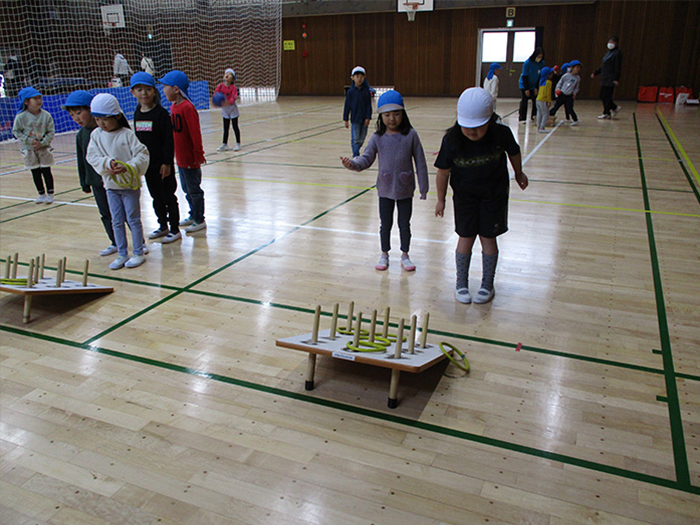 〇・×ゲームやドッチボール、 輪投げ、的あて、大縄跳びなどを楽しみました