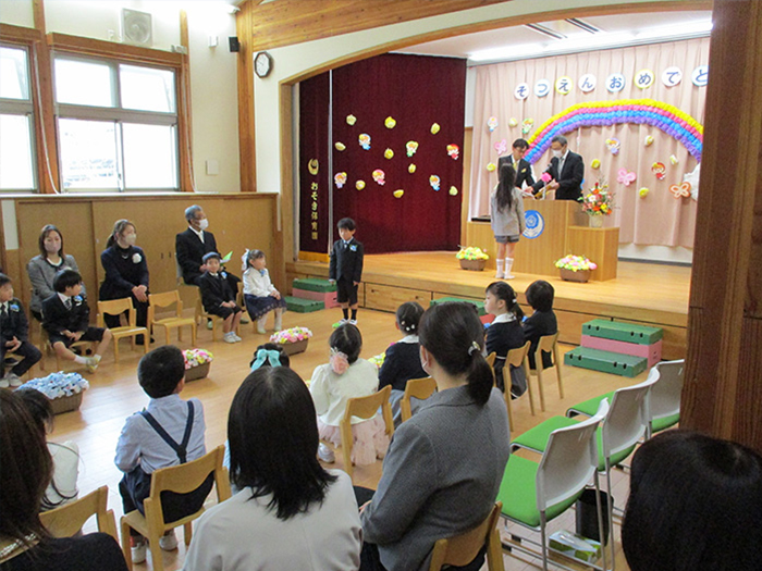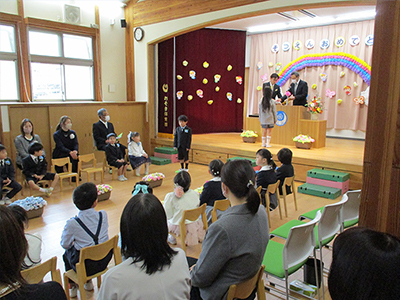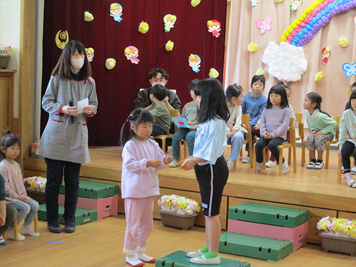 今年は全クラスが参加しました。4歳児が卒園するあさがお組さんに手作りのプレゼントを渡しました
