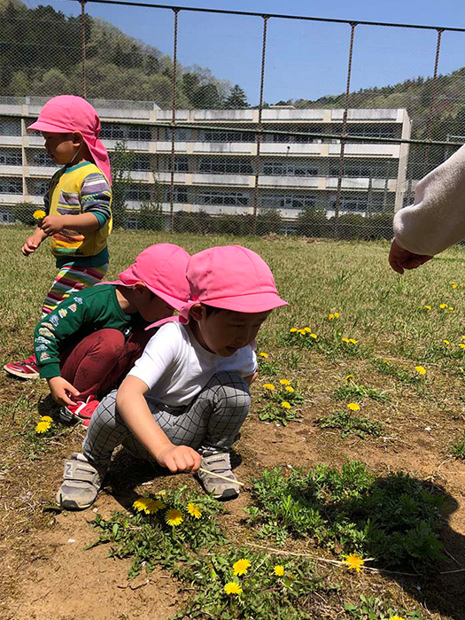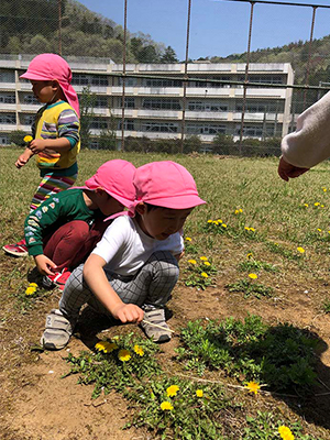 もも組(3歳児)が中学校の旧テニスコートへあそびにいきました。たくさんのたんぽぽや虫に触れて過ごしてきました。