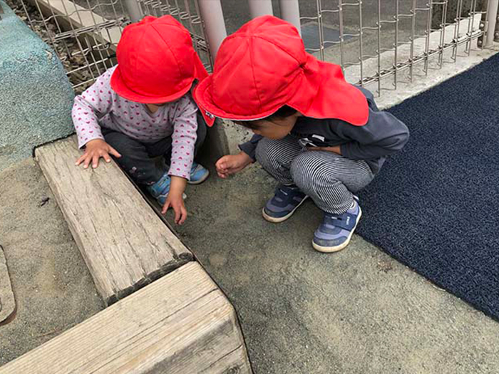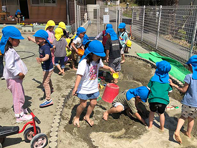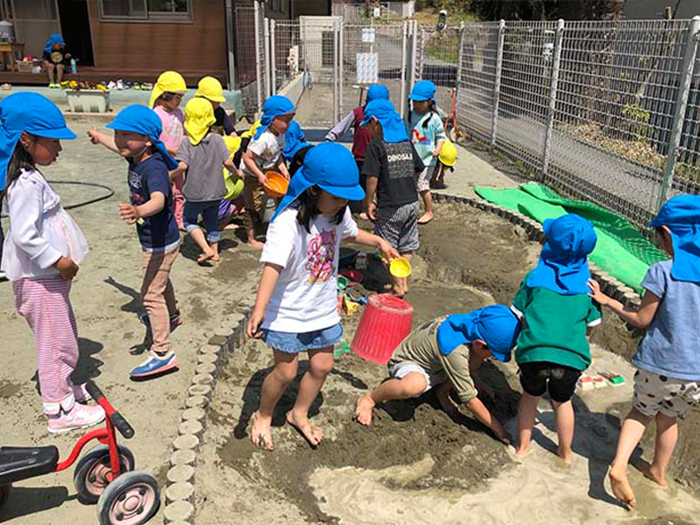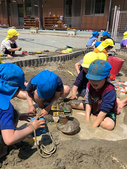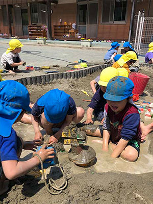 気温が高くなり、砂場では泥んこあそびを楽しんでいました。