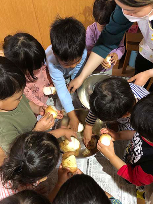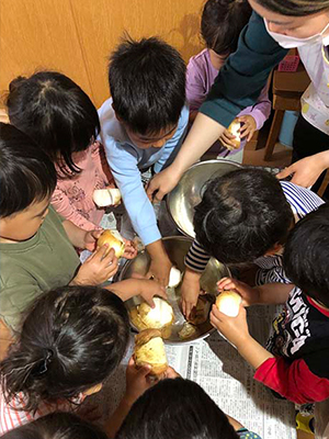 もも組(3歳児)が玉ねぎの皮をむきました。「いいにおい」と言いながらスルッと皮をむいていました。
