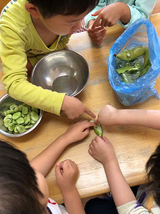 あさがお組(5歳児)「そらまめっておおきい」「ふわふわしてる~」感触を楽しみながら、お手伝いしてくれました。