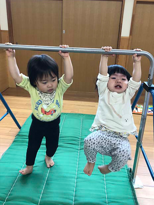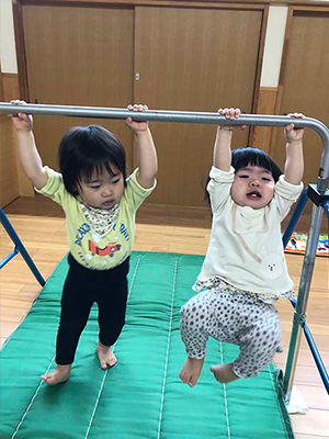 すみれ組(1歳児)がホールで運動あそびをしました。しっかりと鉄棒を握ってぶら下がって楽しんでいました。
