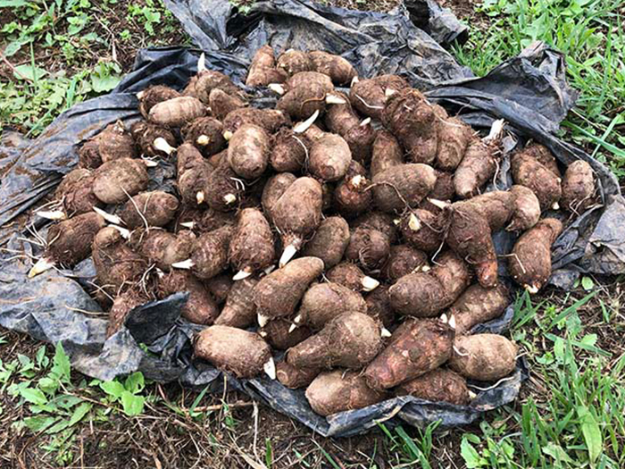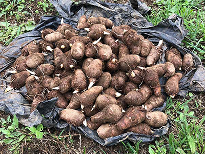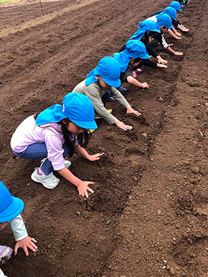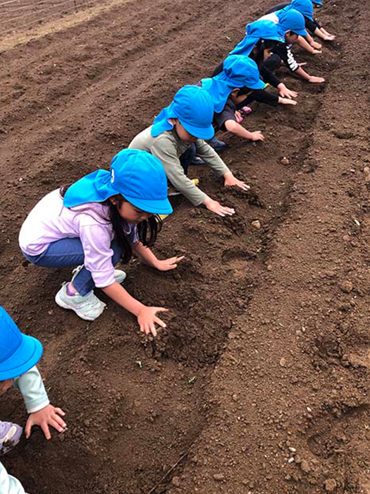 種芋を土の中に入れて優しく土をかけてトントントン「おおきくなってね」と声を掛けながらしていました