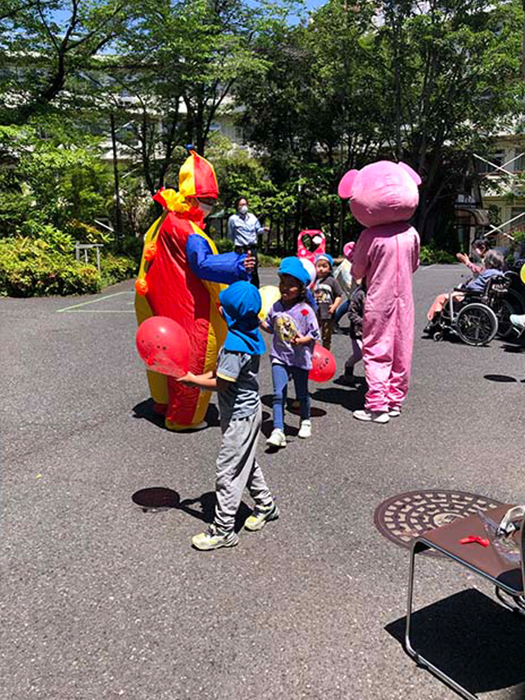 ピエロとくまさんと握手したり触れ合いも楽しみました。風船のお土産もいただきました