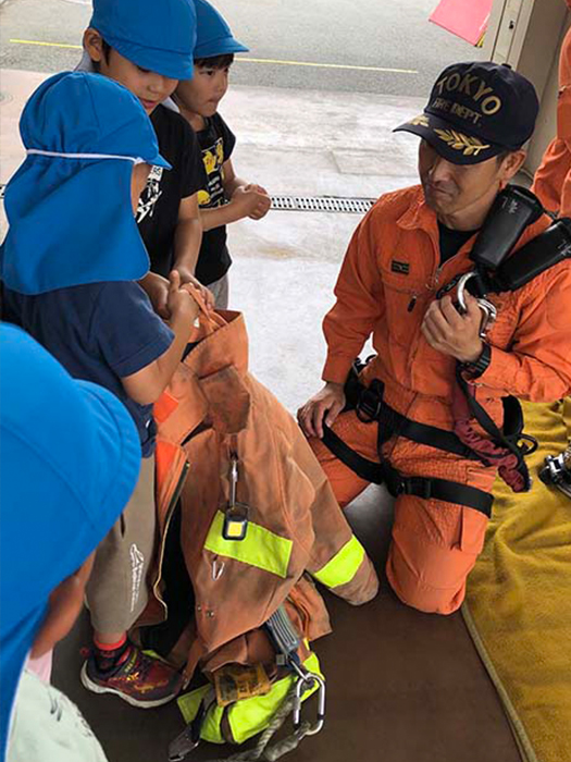 消防士さんの服は重い・・着せてもらったり、持って重さを感じていました