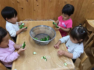2歳児が食育のお手伝いでピーマンの種取りをしました。においをかいだり、感触を楽しんでいました