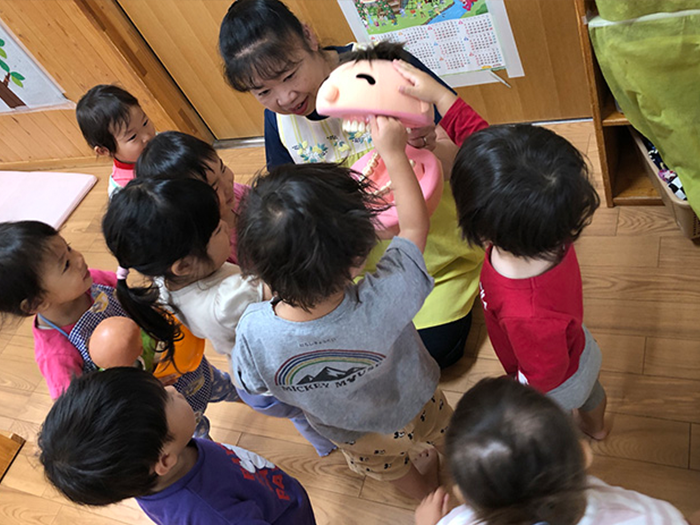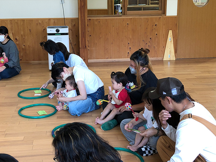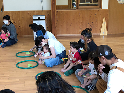 動物のカードを見ながら楽器を鳴らしたりフープを使って体を動かしたり楽しんでいました。