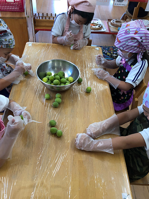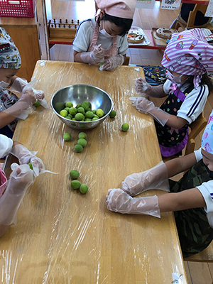 あおいうめだ~いいにおい~と言いながら竹串を使って梅に穴を開けました。
