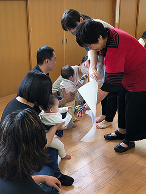 こどもの夢と未来舎の佐藤先生と一緒に親子でのリズム遊びを楽しみました。 紙の穴の中から出てきたマラカスに興味津々・・好きな物を選んで取っていました。 。