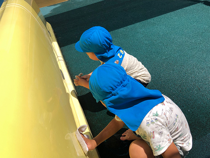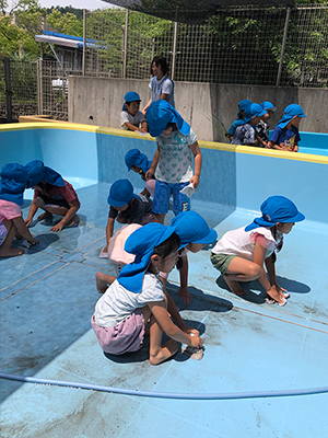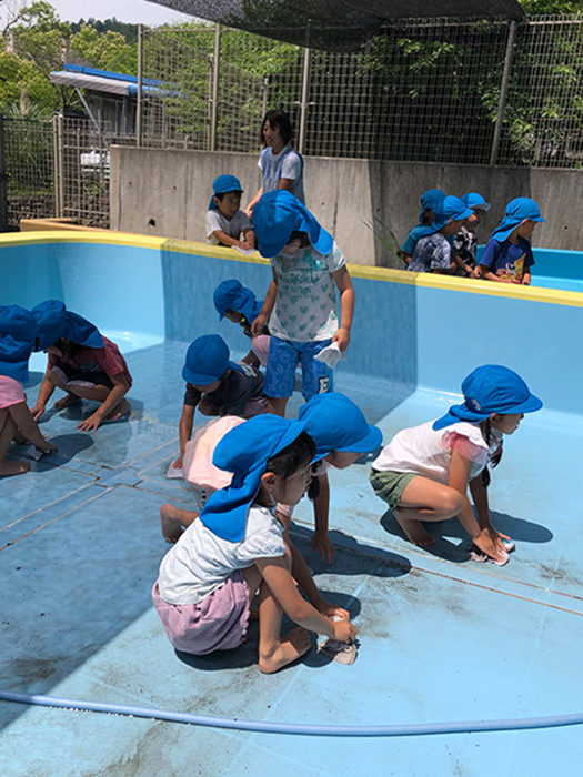 あさがお組(5歳児)がそうじをしてくれました。汚れているプールを見て「ぞうきんできれいにしよ~」とゴシゴシしてくれました。