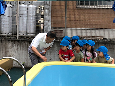 雨の為プールには入れませんでしたが園長先生が塩でお清めしてくれました。