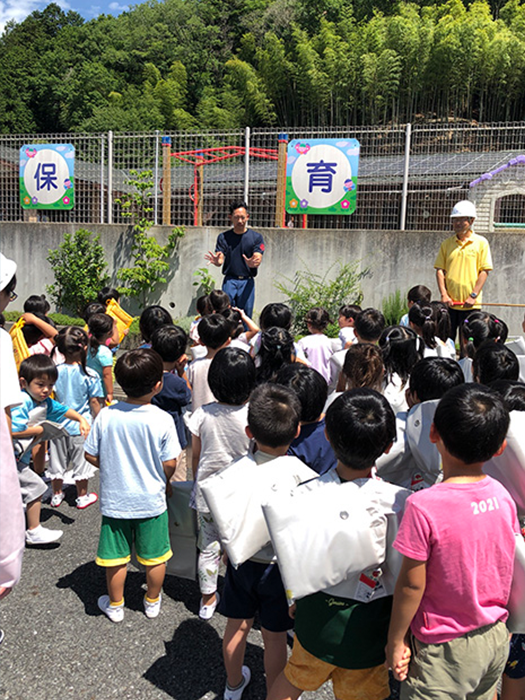 裏山からの火事を想定しての訓練をしました。上手に避難することができて、消防署の方のお話しもよく聞いていました