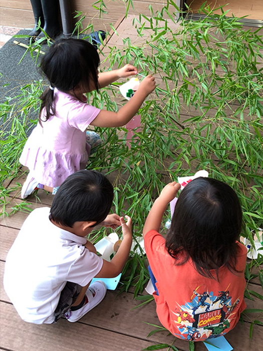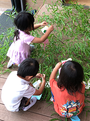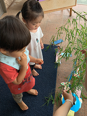 笹の葉に短冊を飾りました、小さいクラスのお友だちは飾りたい場所に一緒に飾りました