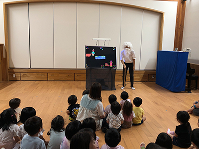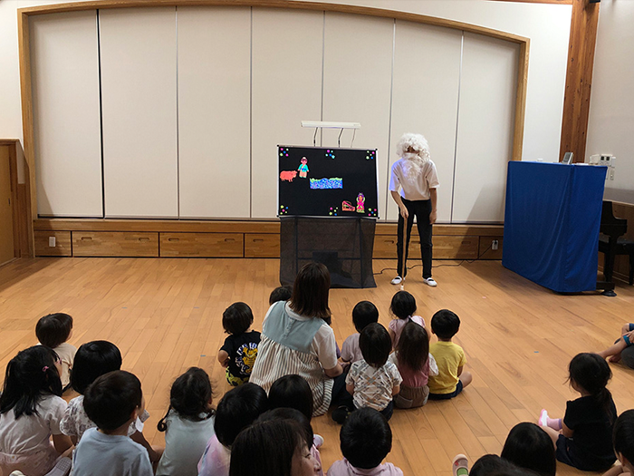 お話しの途中で天の神様が出てきて小さい子はビックリ!!大きいクラスの子は楽しそうでした