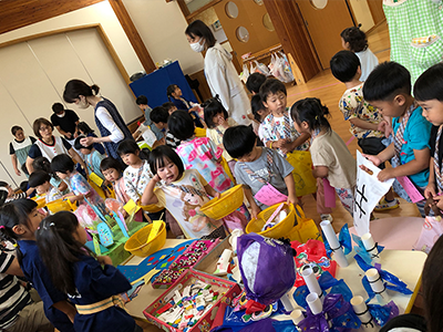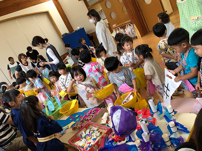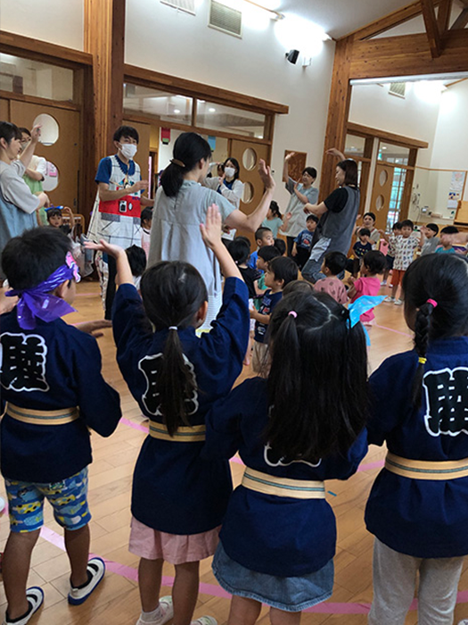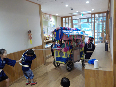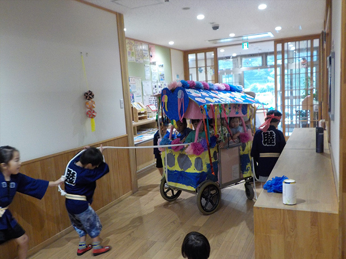 今年もあさがお組(5歳児)が山車を作り、小さいクラスの子を乗せて園内を回りました