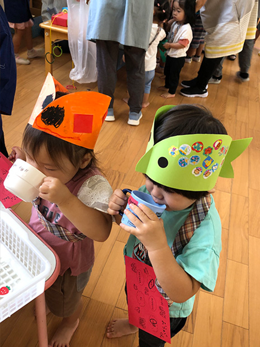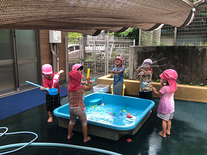 水鉄砲で水かけっこをしたり、お空に向けて飛ばした水がかかるのも楽しんでいました