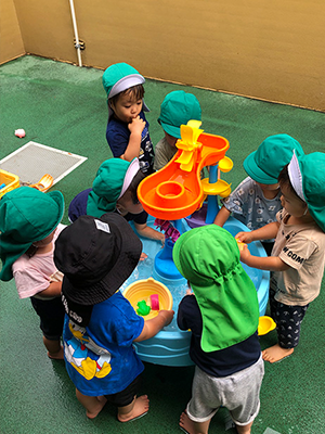 新しいおもちゃに興味津々、水が流れてくると手ですくったり、おもちゃの魚やカニを流したりと水の感触を楽しんでいました