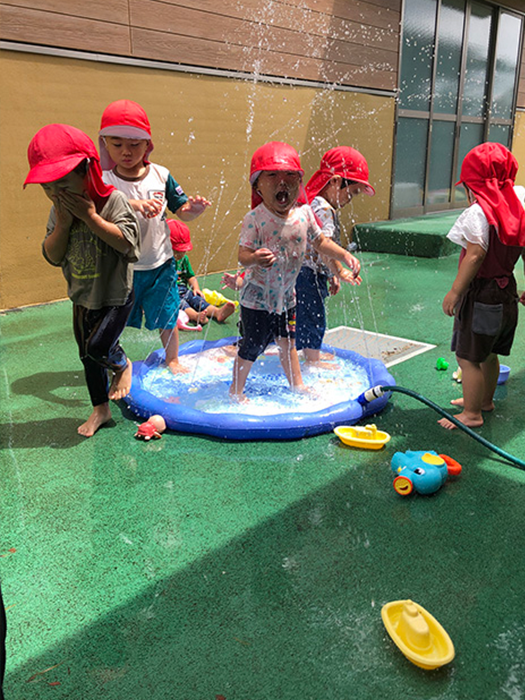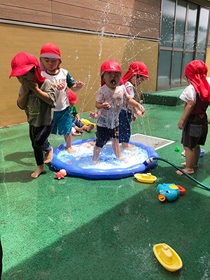 噴水マットからでてくる水を浴びて大喜び!「きゃ~きゃ~」と楽しい笑い声が・・・