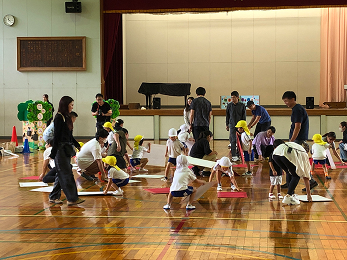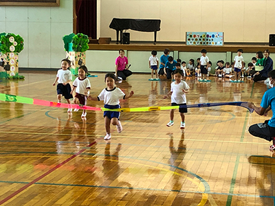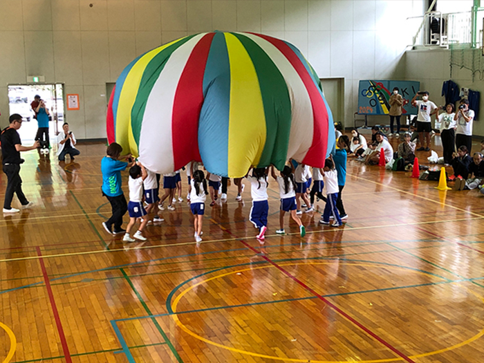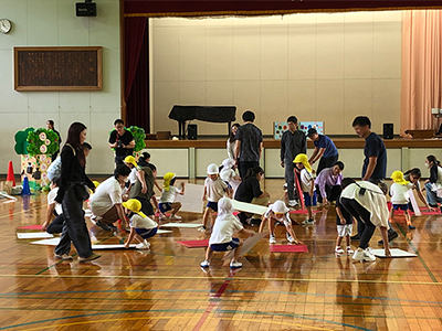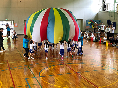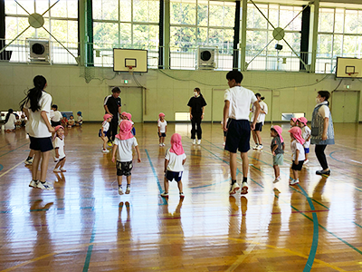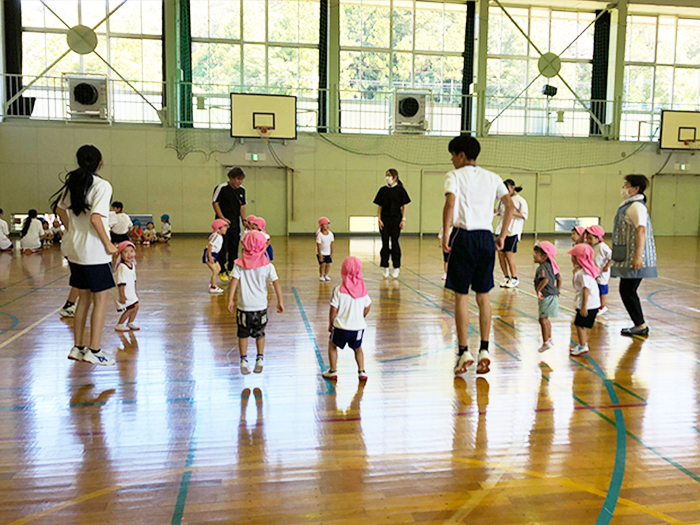 第6中学校の体育館で体育指導をしました。お兄さんお姉さんと一緒に体を動かしまた
