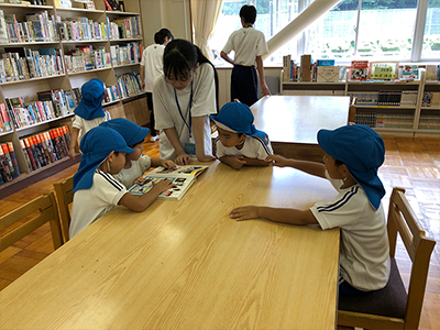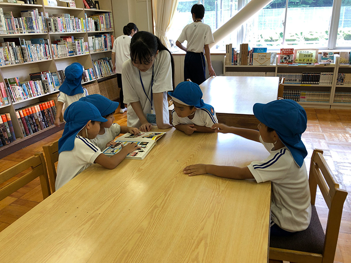 図書室に案内してもらいました。難しい本がたくさん・・虫の図鑑を見て楽しんでいました