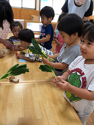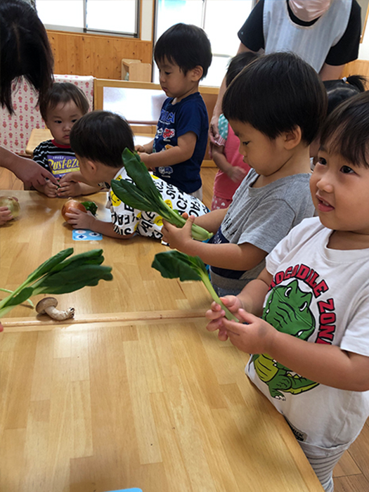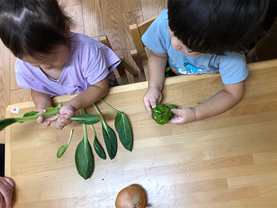 色々な野菜に触れて・・興味津々・・においをかいで???おもしろいお顔を見せてくれました