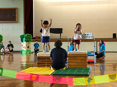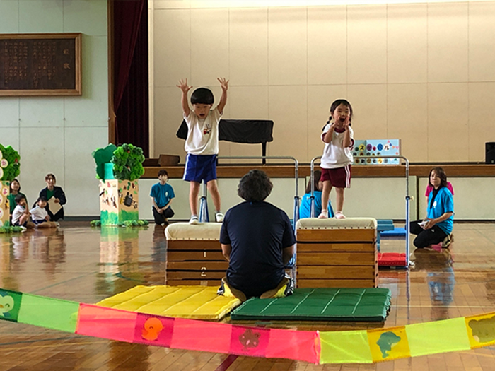 3,4,5歳児がマット、鉄棒、跳び箱を披露しました