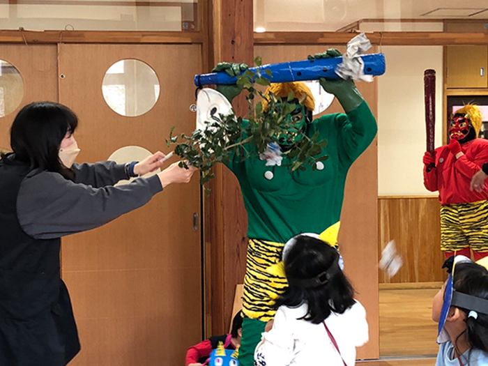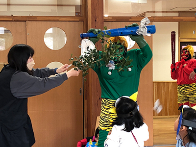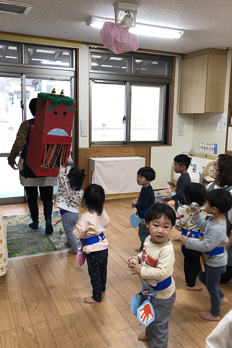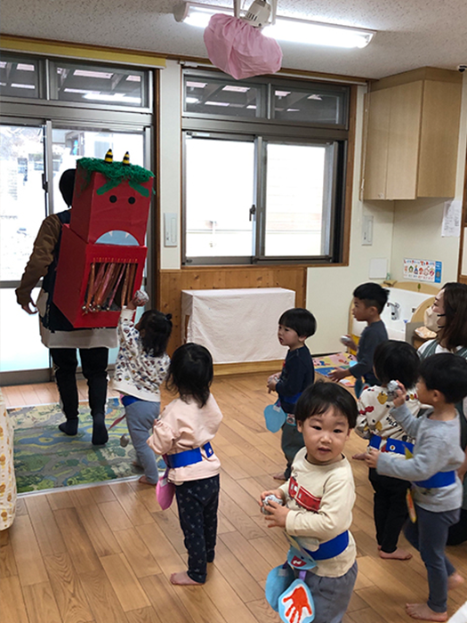 段ボールで作った鬼を保育者が背負って、豆まきを楽しんでいました。