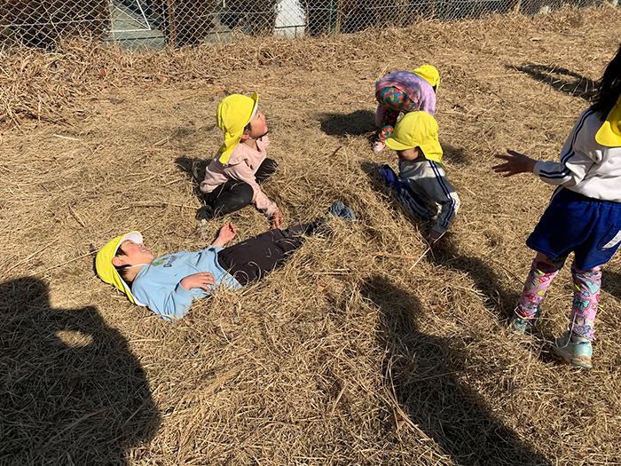 暖かい陽気で枯草をお布団のように・・・・楽しい笑い声が沢山聞こえてきました。