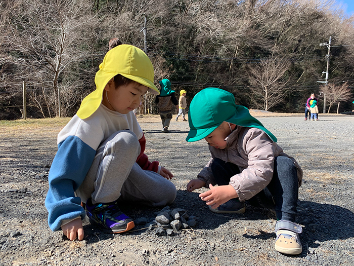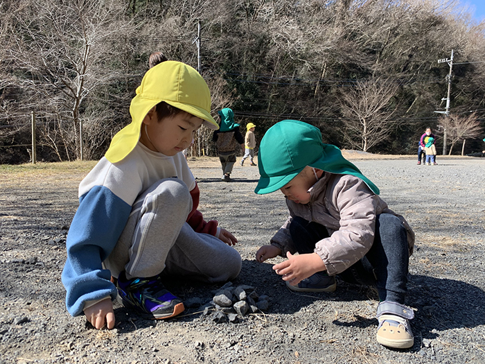 1歳児、4歳児でお散歩へ石を積んで・・・・バーベキューごっこを楽しんでいました。